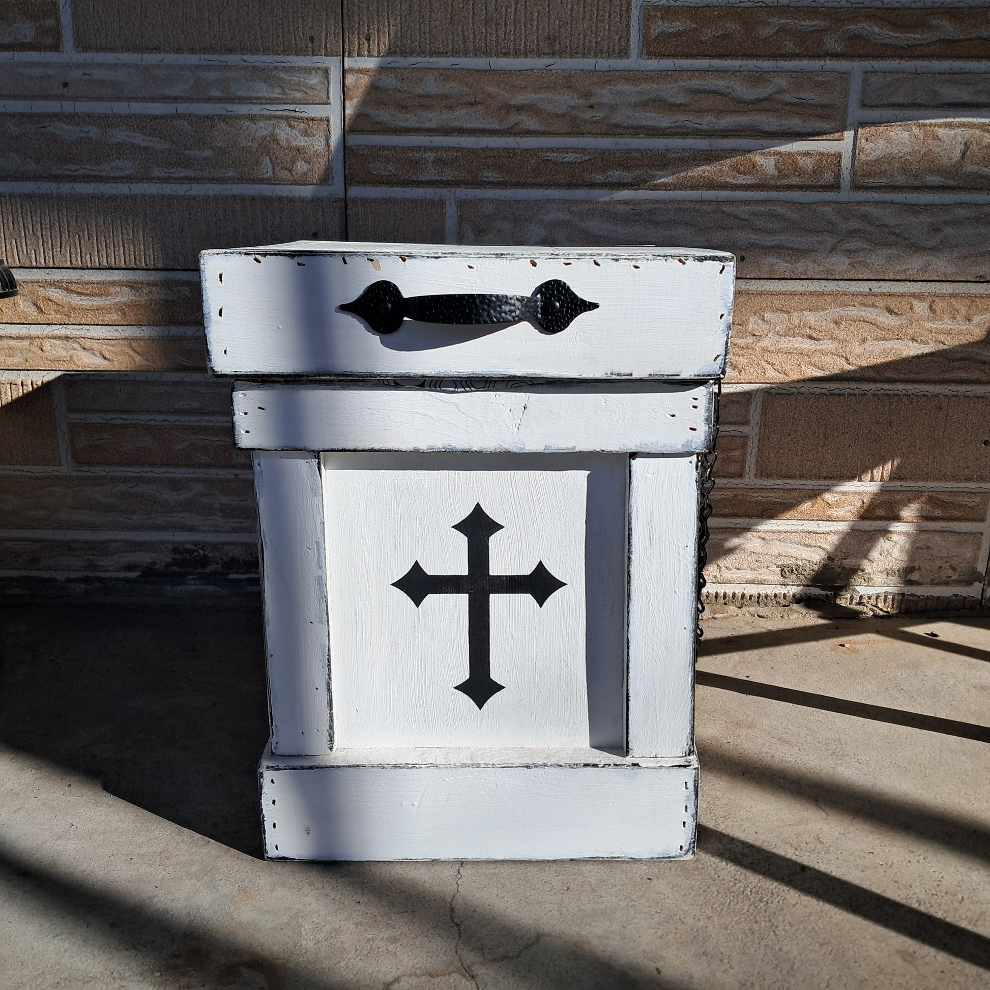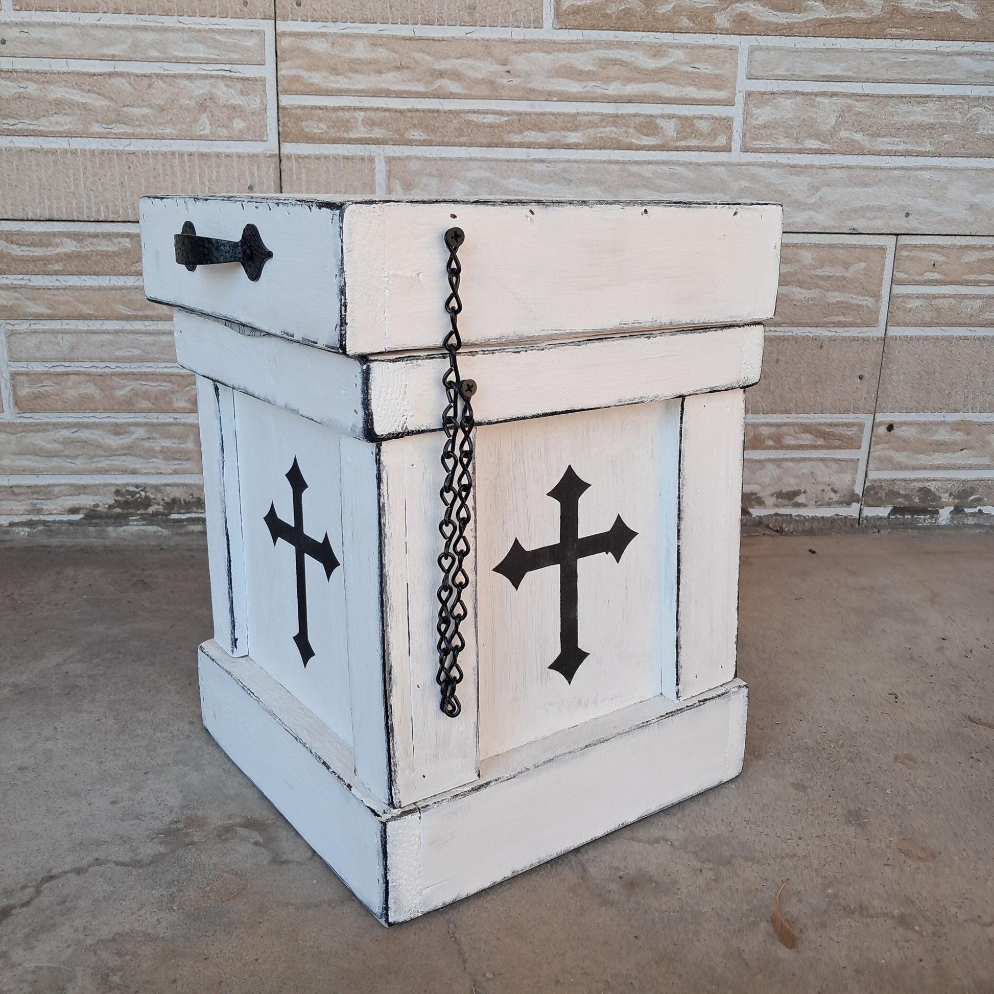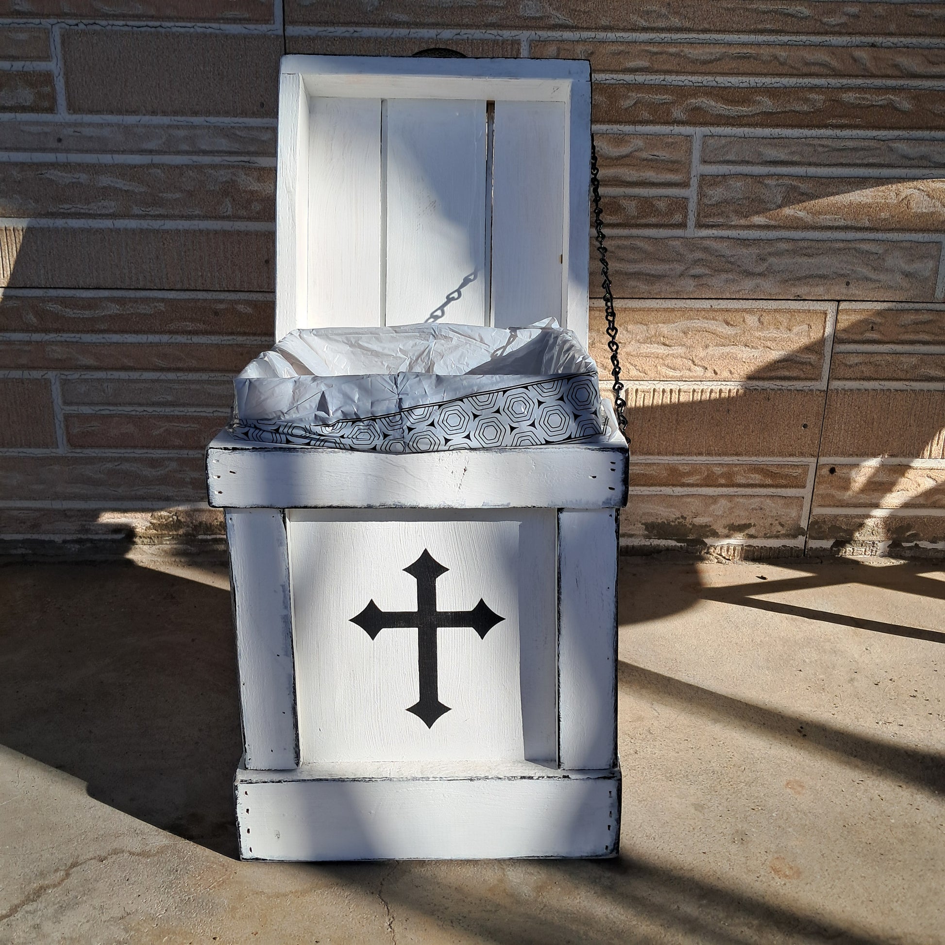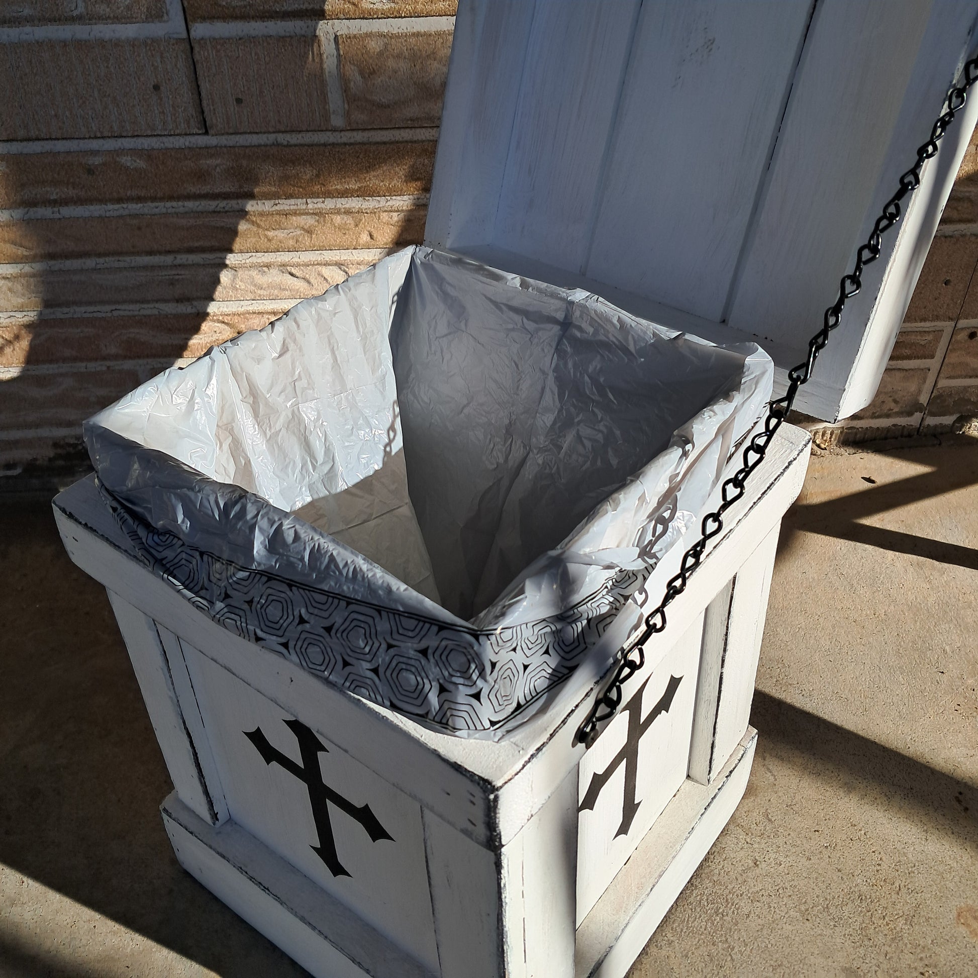 Made from Reclaimed Wood, this Gorgeous Gothic 4-gallon trash Bin was painted using White Paint and features Black Hardware.