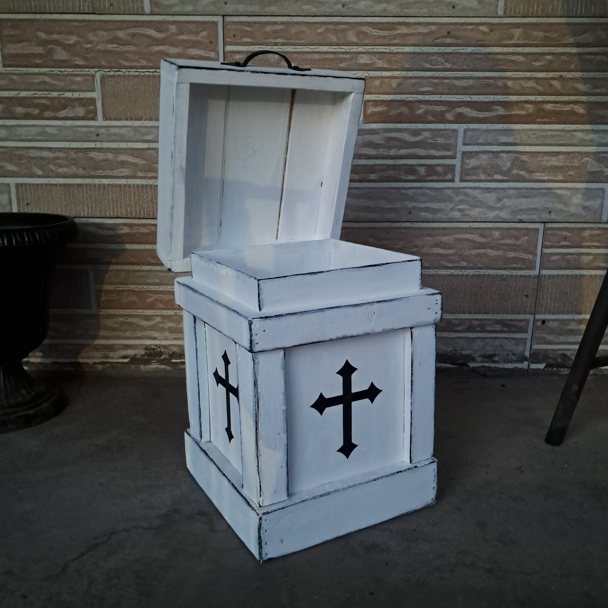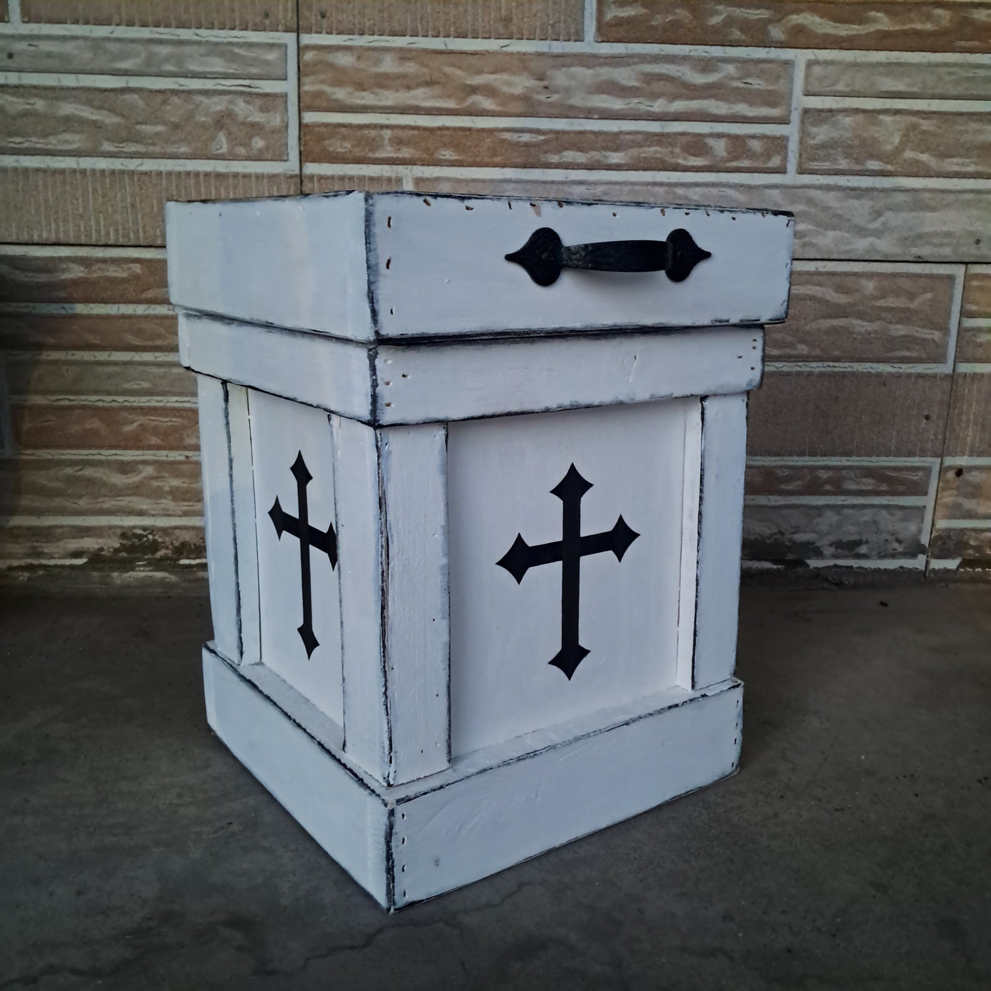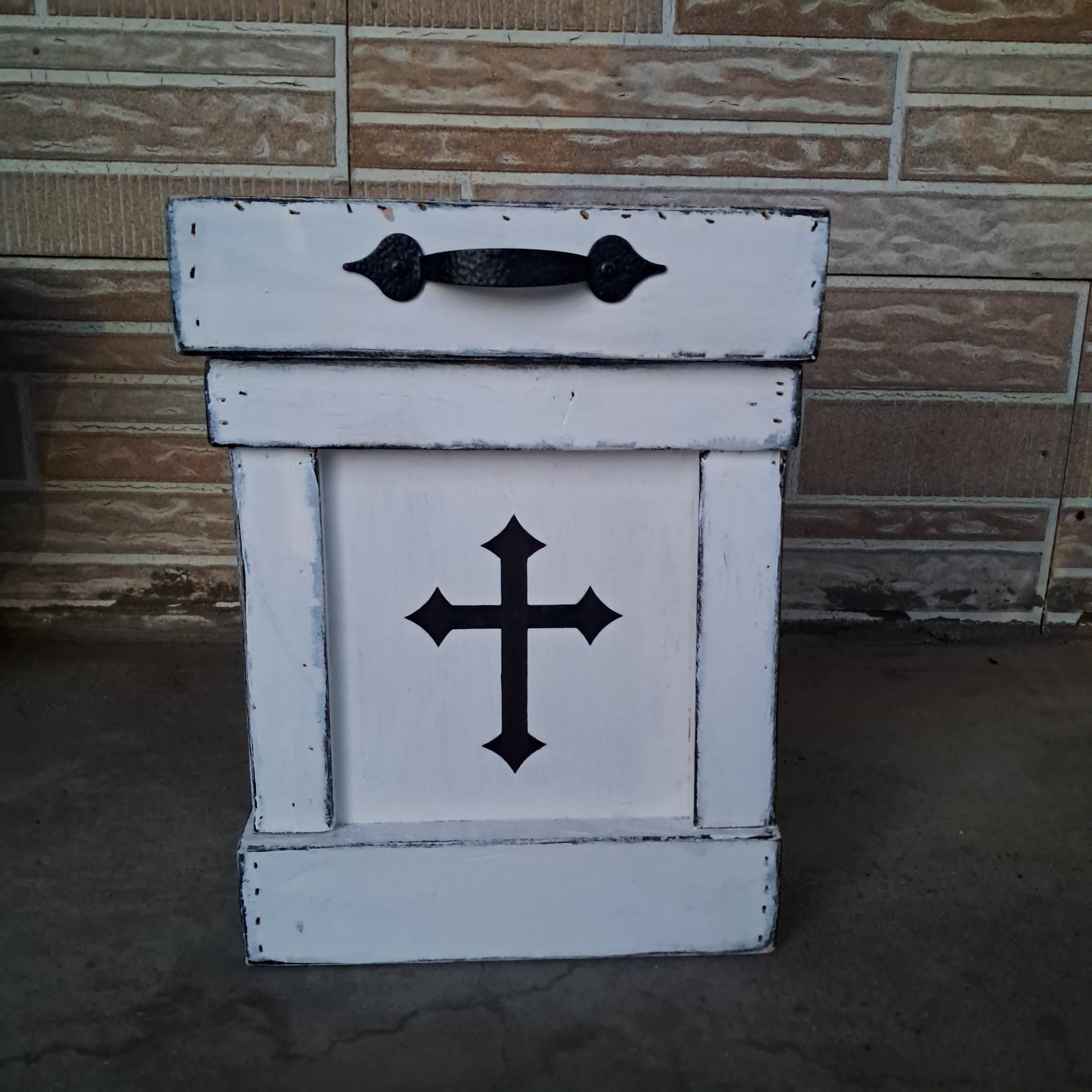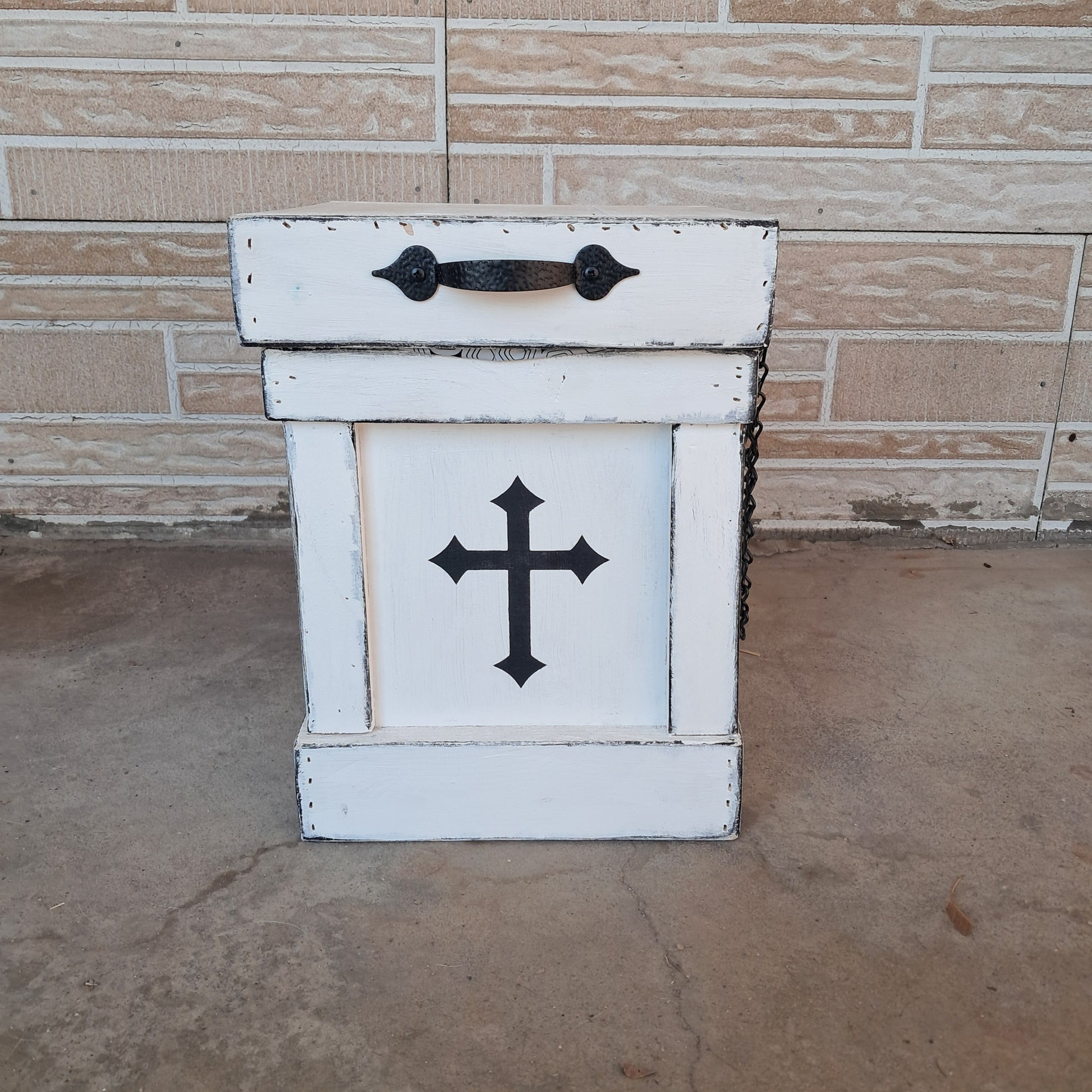 Made from Reclaimed Wood, this Gorgeous Gothic 4-gallon trash Bin was painted using White Paint and features Black Hardware.